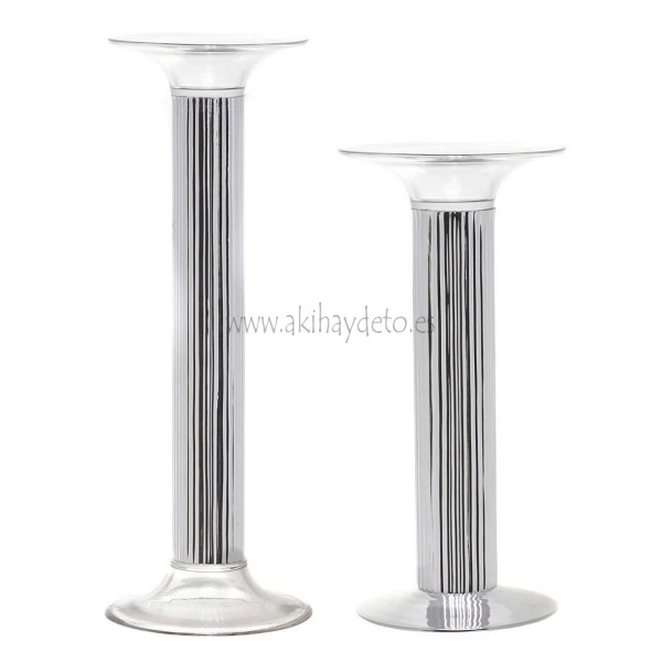 Portavelas decorativo en vidrio color plata. Disponible en dos alturas.