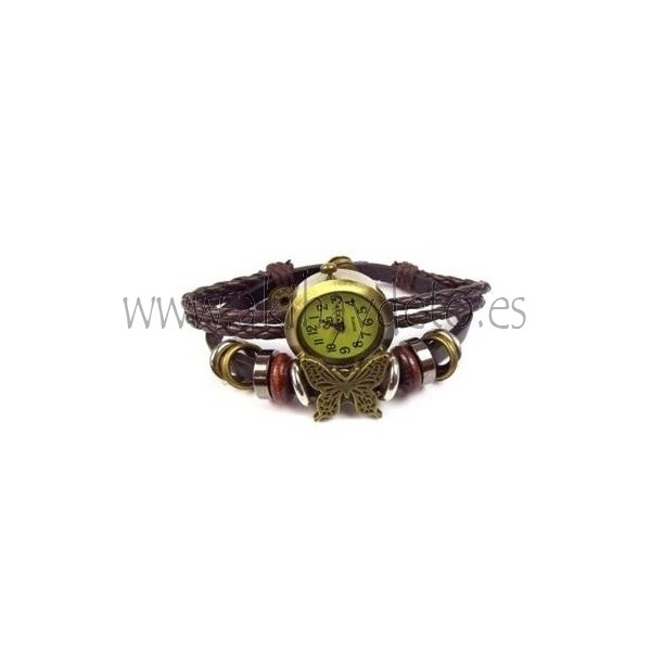 Brazalete de cuero color marrón con reloj y abalorios, modelo mariposa.