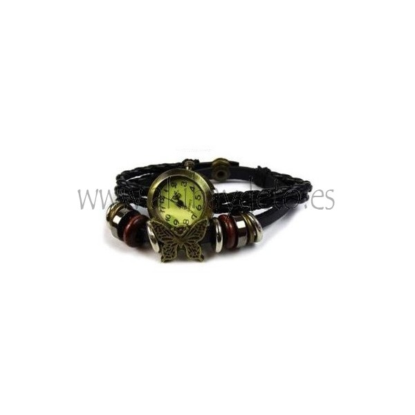 Brazalete de cuero color negro con reloj y abalorios, modelo mariposa.