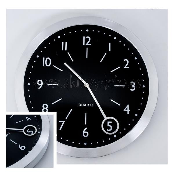 Reloj decorativo de pared, diámetro 45,5 cm, aluminio con fondo negro.