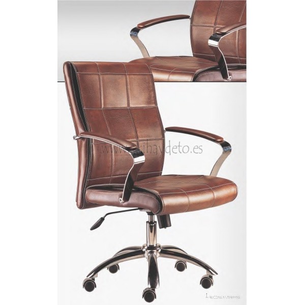 Silla giratoria. Regulable en altura, mecanismo basculante con bloqueo. Simil cuero envejecido, color marron.