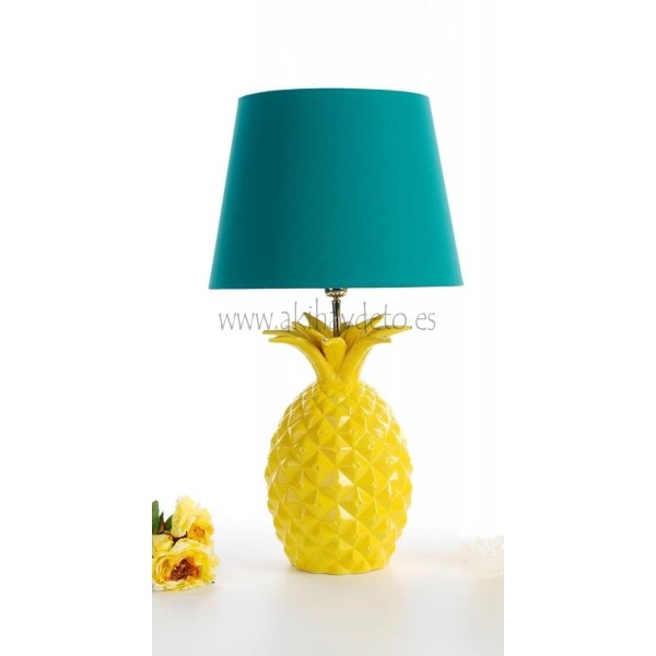 Lámpara de sobremesa con base piña decorativa en cerámica color amarillo y pantalla azul, medidas aproximadas 73x40 cm