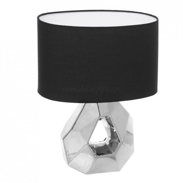 Lámpara de sobremesa con base de cerámica plateada y pantalla negra, medidas 33x18x45 cm aproximadamente.