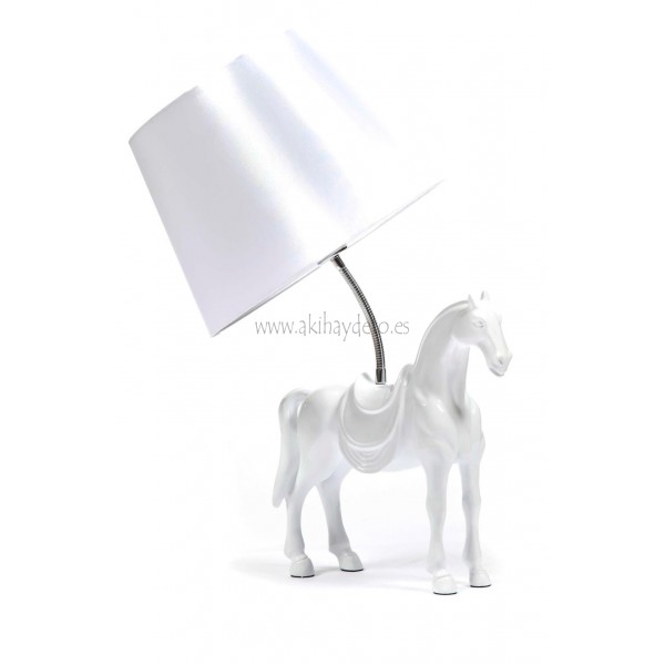 Lámpara de sobremesa con base de caballo tipo flexo y pantalla en color blanco, medidas aproximadas 3x37x67 cm.