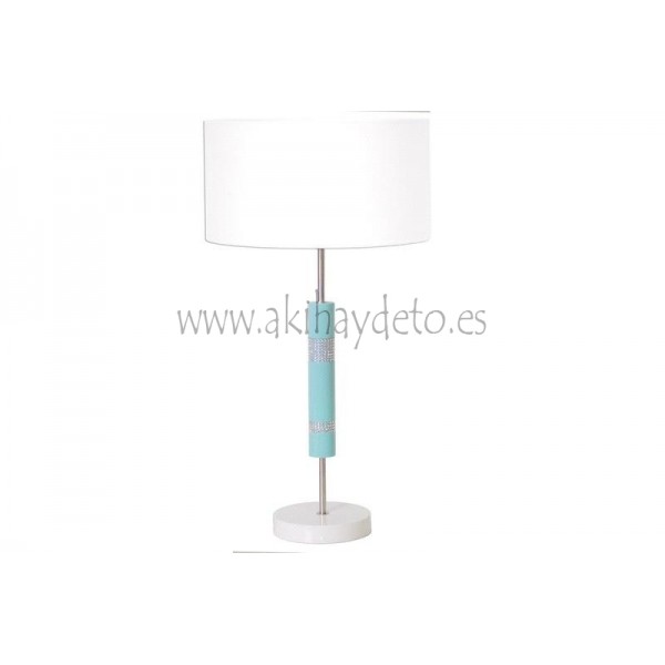 Lámpara de sobremesa con pantalla color blanca y base metal azul celeste con cristalitos.