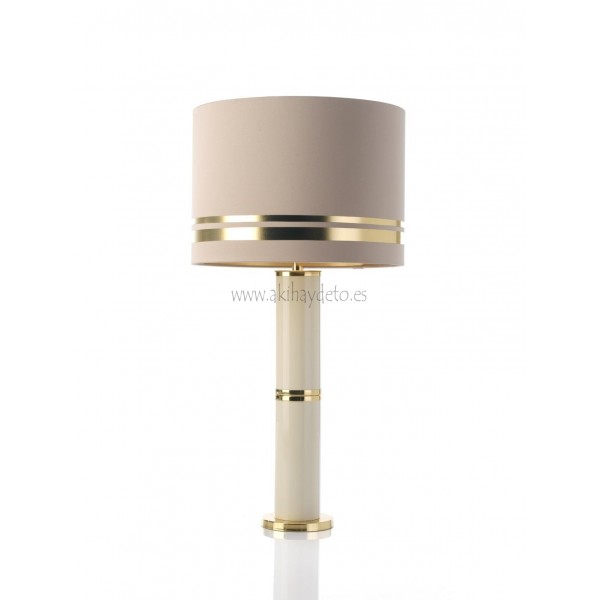 Lámpara de sobremesa con base de metal y pantalla color beige y franjas en oro.
