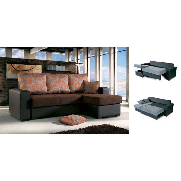 Sofá espuma poliuretano. Sistema de apertura facil. Medidas colchon 140 x 190 cm. Tejido respaldo vera naranja y asiento bambu chocolate.