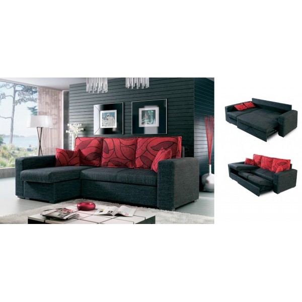 Sofa espuma poliuretano. Sistema de apertura enganche, medidas colchon 140 x 205 cm. Tejido respaldo traviata rojo y asiento y base bambu negro.