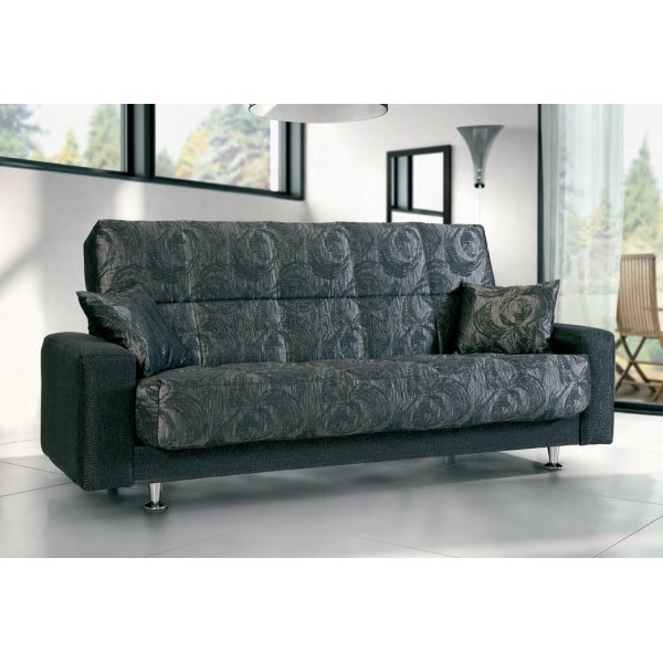 Sofa espuma poliuretano. Ribeteado dos caras con platabanda y tapas en damasco acolchado. Sistema de apertura bisagra presion, medidas colchon 125 x 190 cm. Tejido edredon vera gris y base jara negro. Diferentes tipo de colchon.
