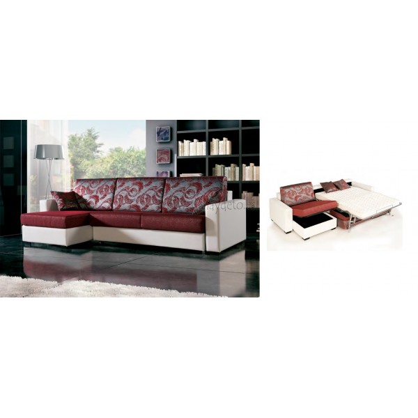 Sofa sistema de apertura italiano, medidas colchon 135 x 195 cm. Espuma poliuretano. Ribeteado dos caras con platabanda y tapas en damasco acolchado. Tejido respaldo alia rojo, asiento jara rojo y base polipiel blanca.