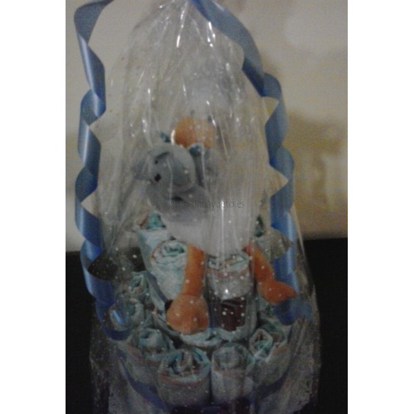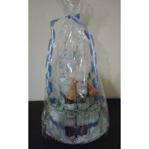 Tarta de pañales 2 pisos, formada aproximadamente por 25 pañales de talla T-3 (4 - 10 kilos) marca DODOT y peluche 0+ meses en color azul de 18 cm alto, el peluche cumple con la normativa EN 71 CE. Tarta de pañales decorada con lazos azules y papel celofan transparente en bandeja de diámetro 25 cm.