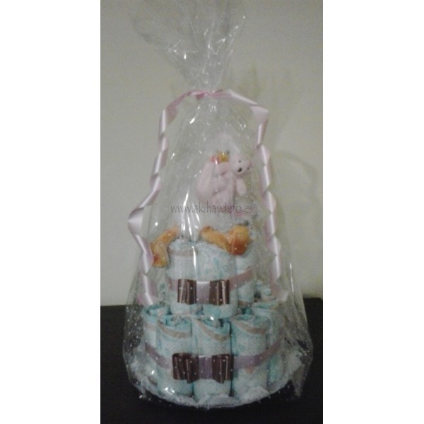 Tarta de pañales 2 pisos, formada aproximadamente por 25 pañales de talla T-3 (4 - 10 kilos) marca DODOT y peluche 0+ meses en color rosa de 18 cm alto, el peluche cumple con la normativa EN 71 CE. Tarta de pañales decorada con lazos rosas y papel celofan transparente en bandeja de diámetro 25 cm.