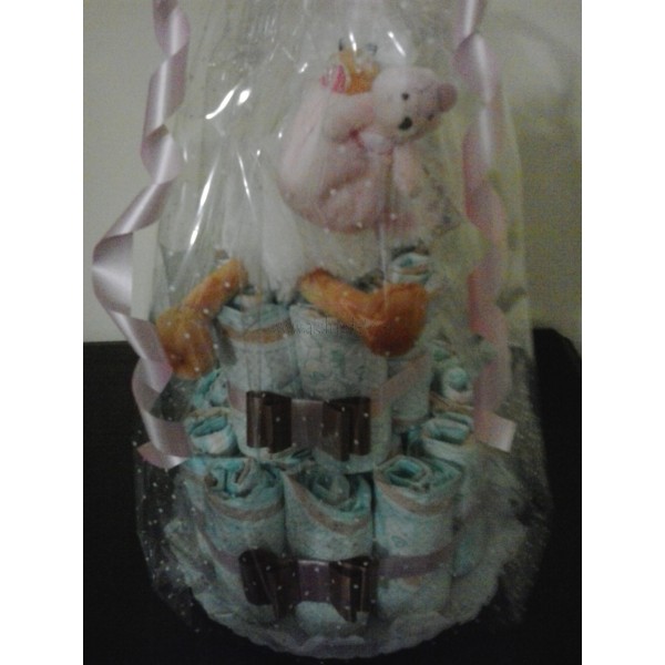 Tarta pañales 2 pisos rosa Ø25 cm + peluche 0+ meses