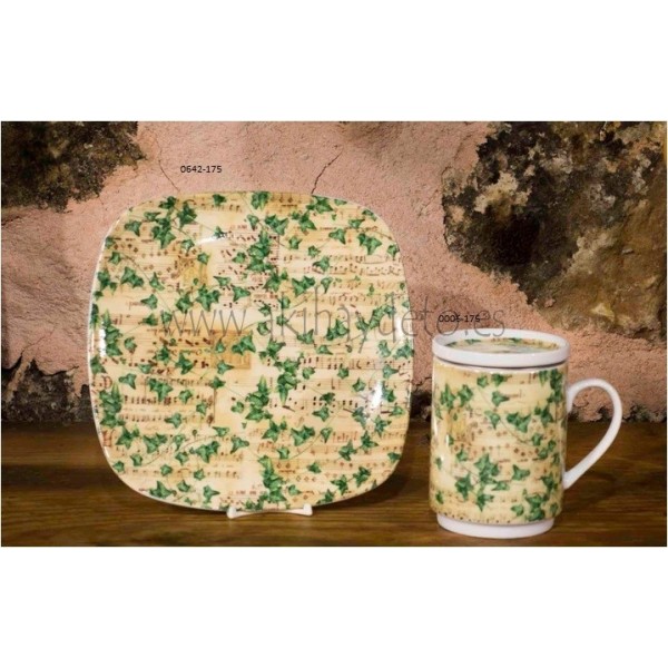 Juego de té individual. Tisana de porcelana con filtro tapizada modelo Ivy Musical, taza para infusiones.