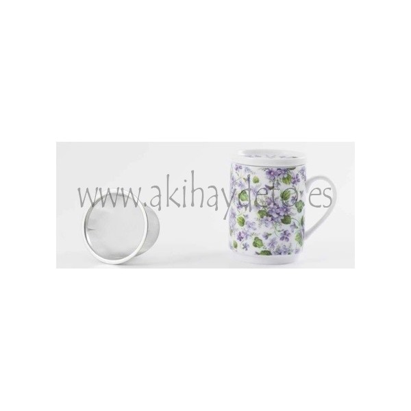 Tisana de porcelana con filtro tapizada modelo Violetas, taza para infusiones.