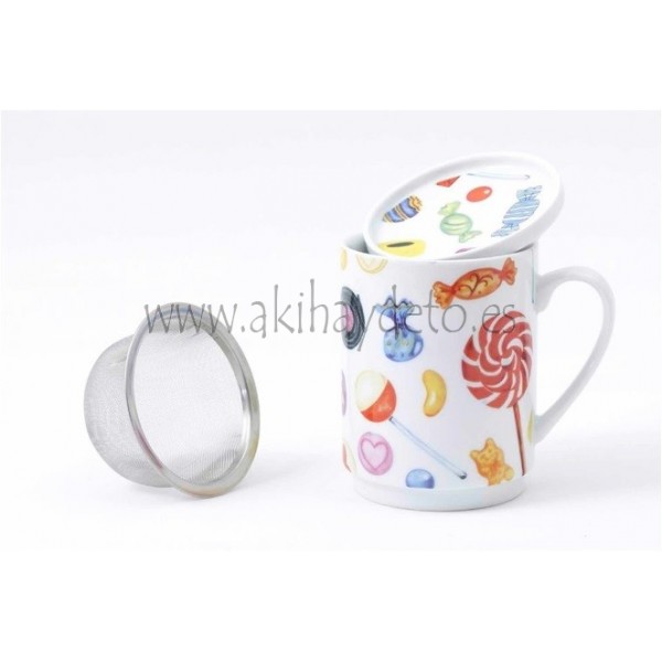 Tisana de porcelana con filtro tapizada modelo Golosinas: piruletas, caramelos,... taza para infusiones.
