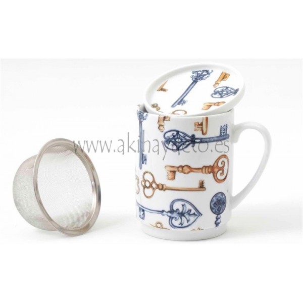 Tisana de porcelana con filtro tapizada modelo Llaves, taza para infusiones.