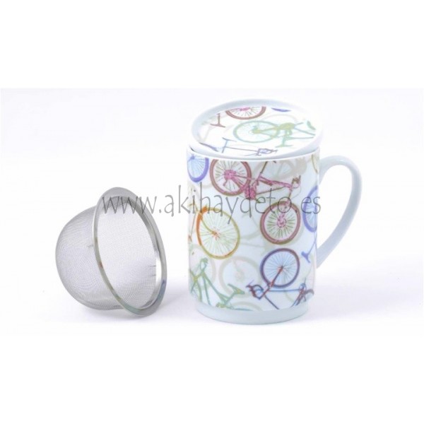 Tisana de porcelana con filtro tapizada modelo Bicicletas, taza para infusiones.