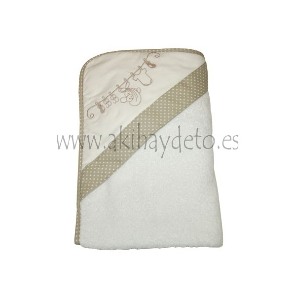 Toalla de baño para bebé color beige con lunares blancos y bordados motivos bebé.