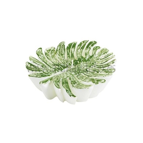 Vela Decoración Flor, forma Hoja Monstera, color Blanco y Verde, medidas 14,2x14,8x3,8 cm. 10 horas de quemado.