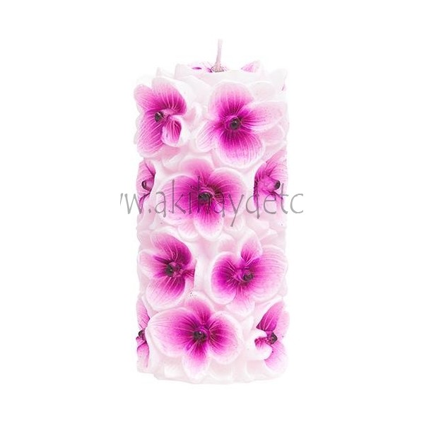 Vela Decoración Cilíndrica, forma Orquídea en color Blanco y Morado, medidas 7,5x14,7 cm. 30 horas de quemado.