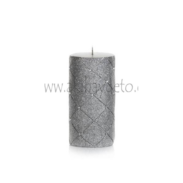 Vela cilíndrica con piedras de cristalitos y purpurina color plateado, medidas 7x15 cm.