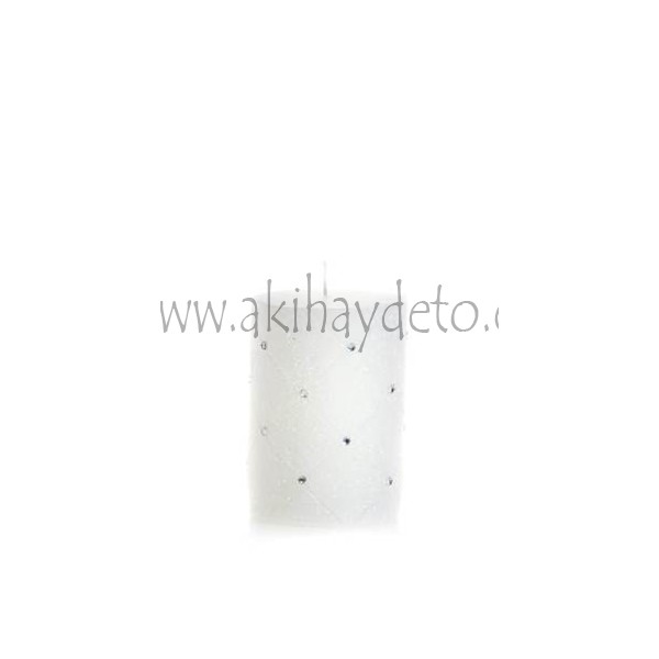 Vela cilíndrica con piedras de cristalitos y purpurina color blanco, medidas 7x10 cm.